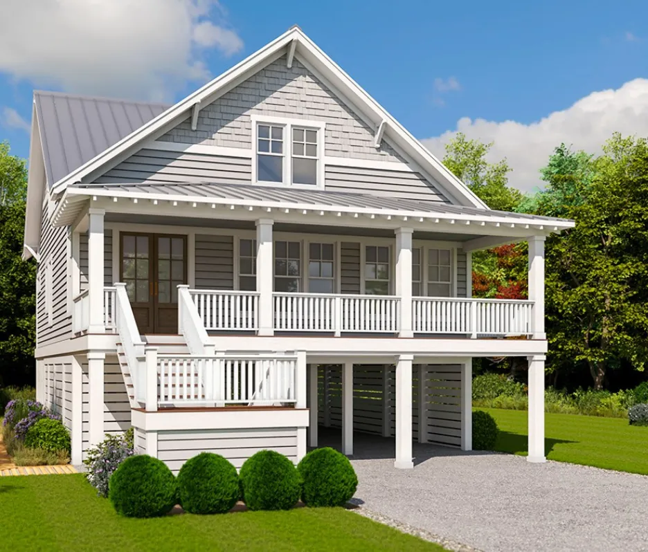 Our piling home plans are designed for durability and beauty in areas where elevated construction is essential — perfect for coastal, lakefront, or flood-prone properties. These raised designs not only meet FEMA and local building code requirements, but they also maximize your view, airflow, and outdoor living space.