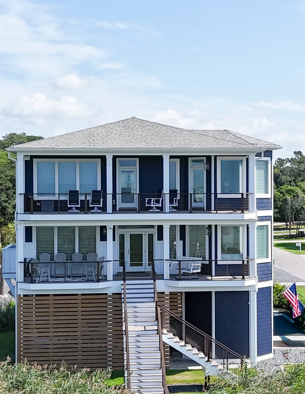Elegant 4-bedroom piling home with inverted layout, spacious porches, elevator, and open living areas.