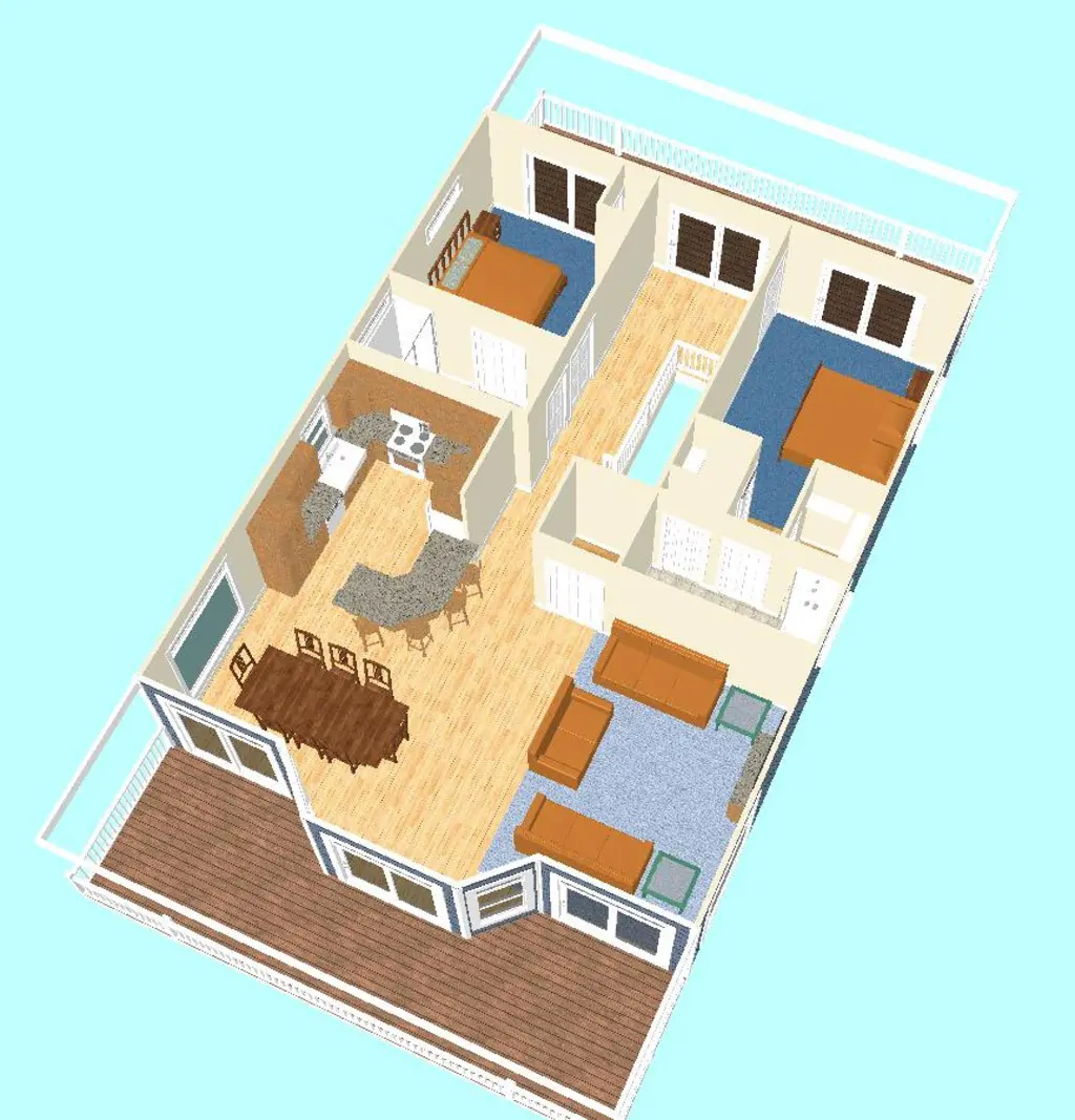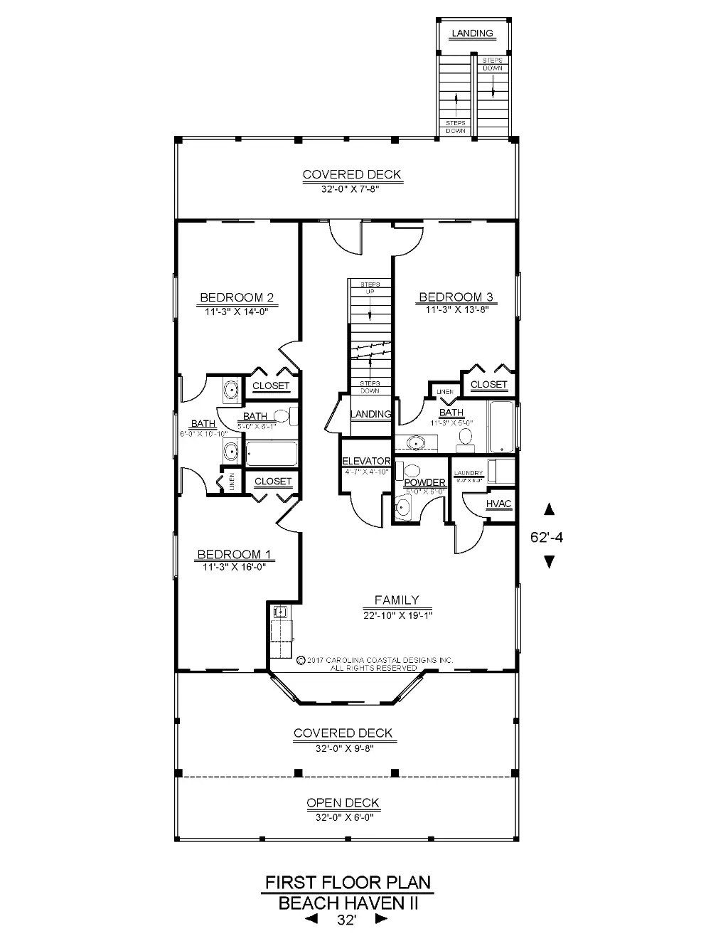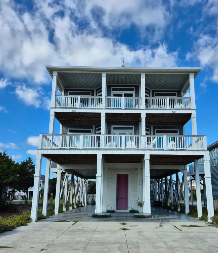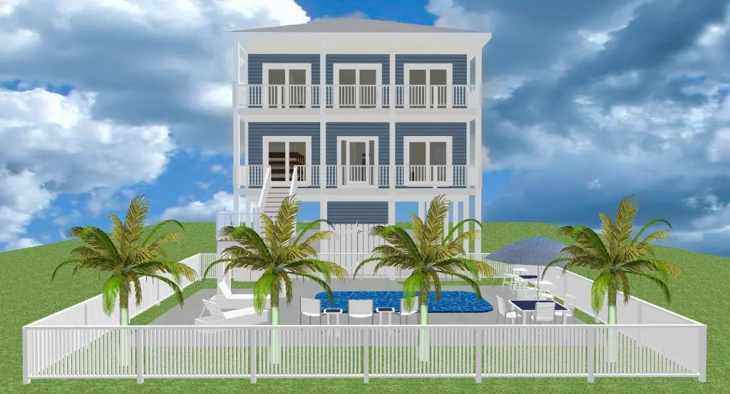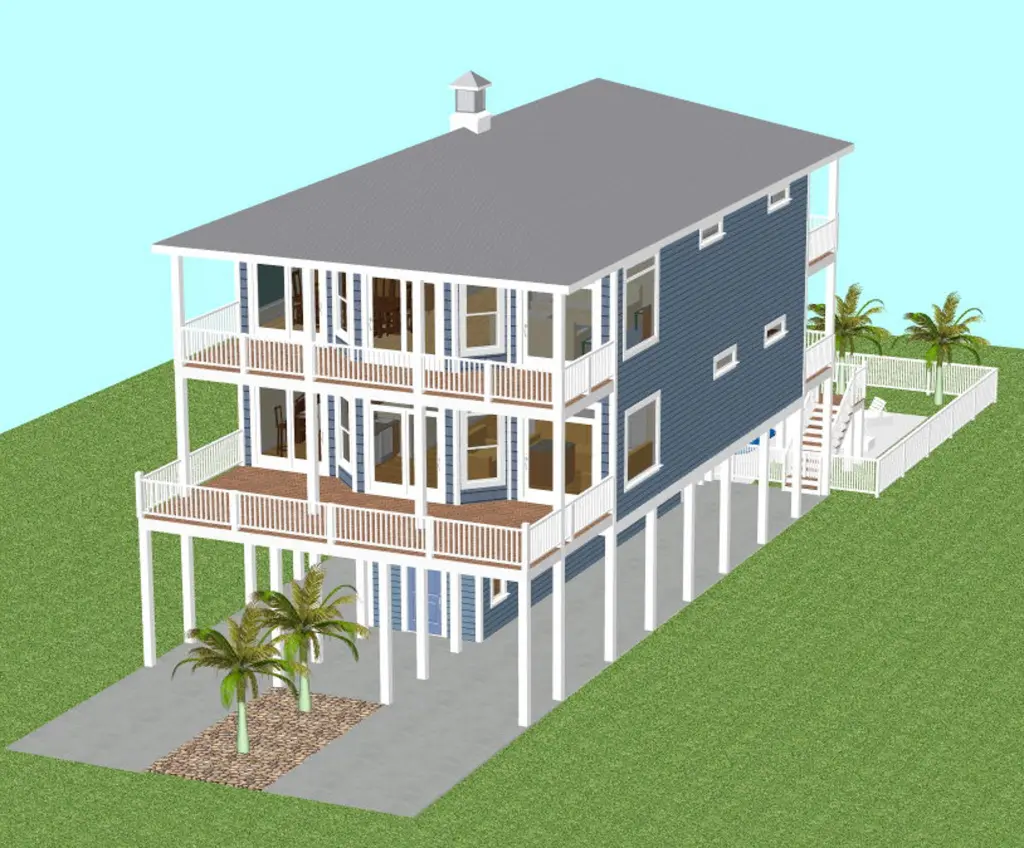 Beach Haven II is a 5-bedroom piling home designed to maximize natural light, airflow, and scenic views in coastal or other picturesque settings. An inverted floor plan places the main living areas on the upper level, while most bedrooms are located on the first floor for privacy and convenience. Expansive front and rear porches, along with a passenger elevator, create a comfortable layout suitable for full-time living, vacations, or rental use.