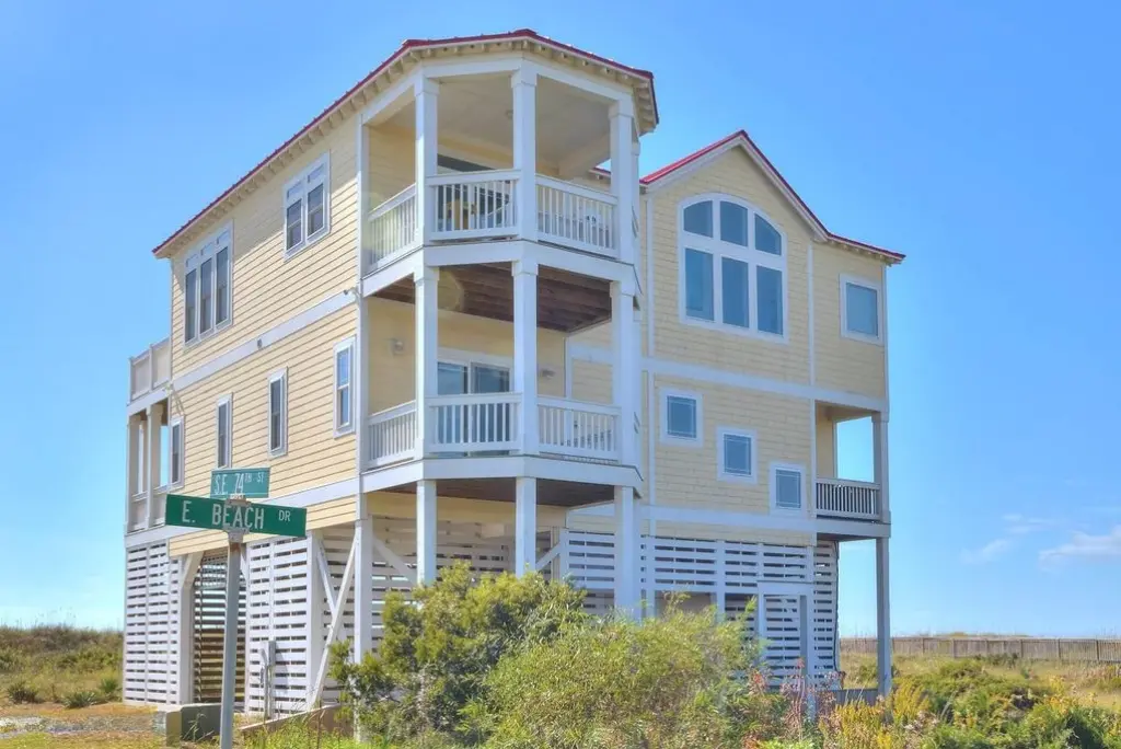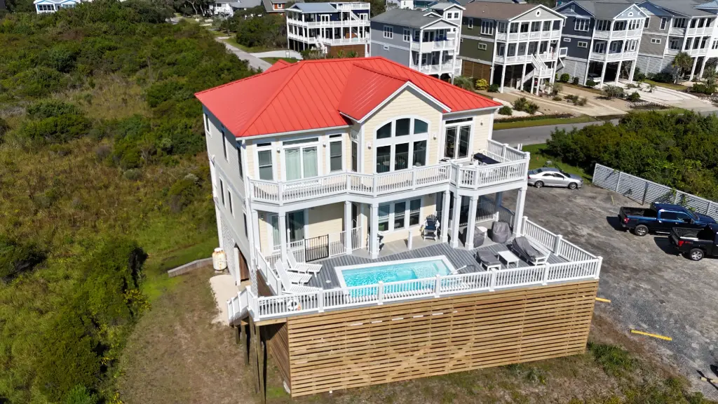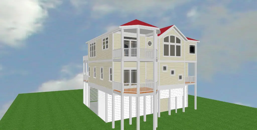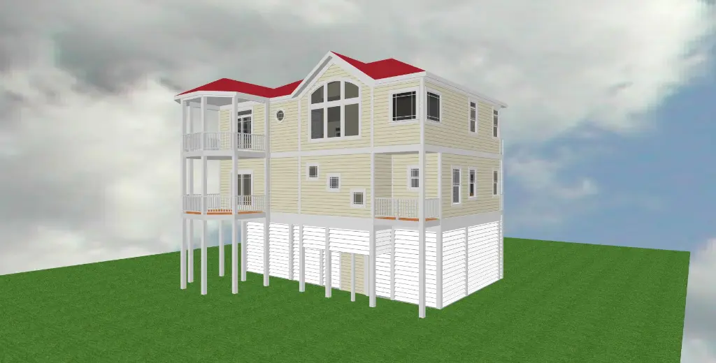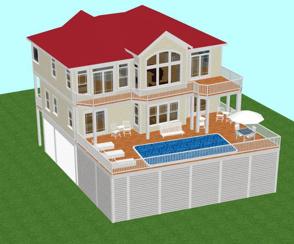 This 4-bedroom home features an inverted floor plan and scenic bi-level front porches, designed to enhance views and provide comfortable living for family and guests in coastal or other picturesque settings. An interior rear staircase and passenger elevator offer convenient access throughout. Note: The elevated deck and swimming pool were added after the original build; the construction drawings do not include the pool & deck design.