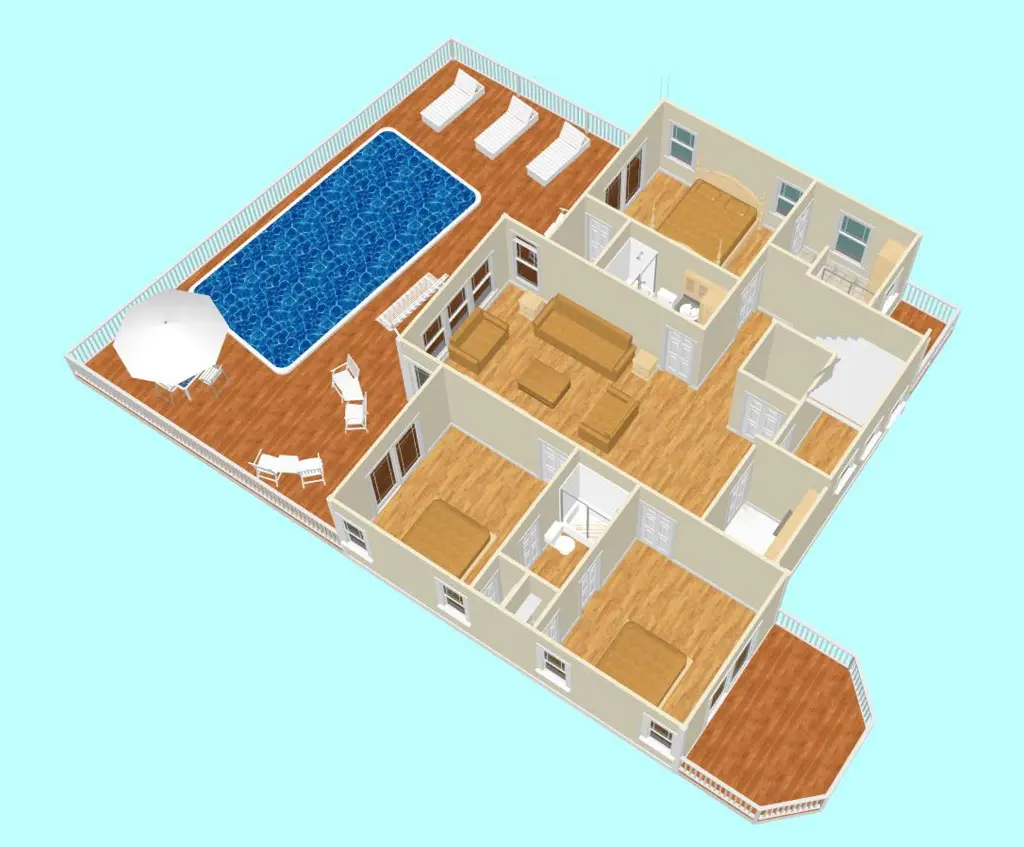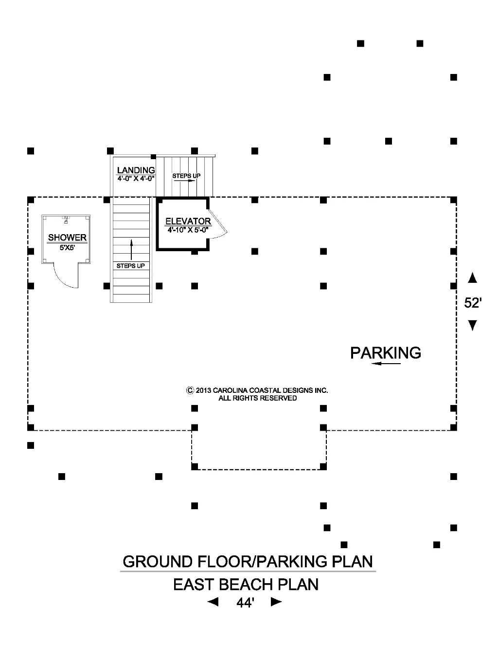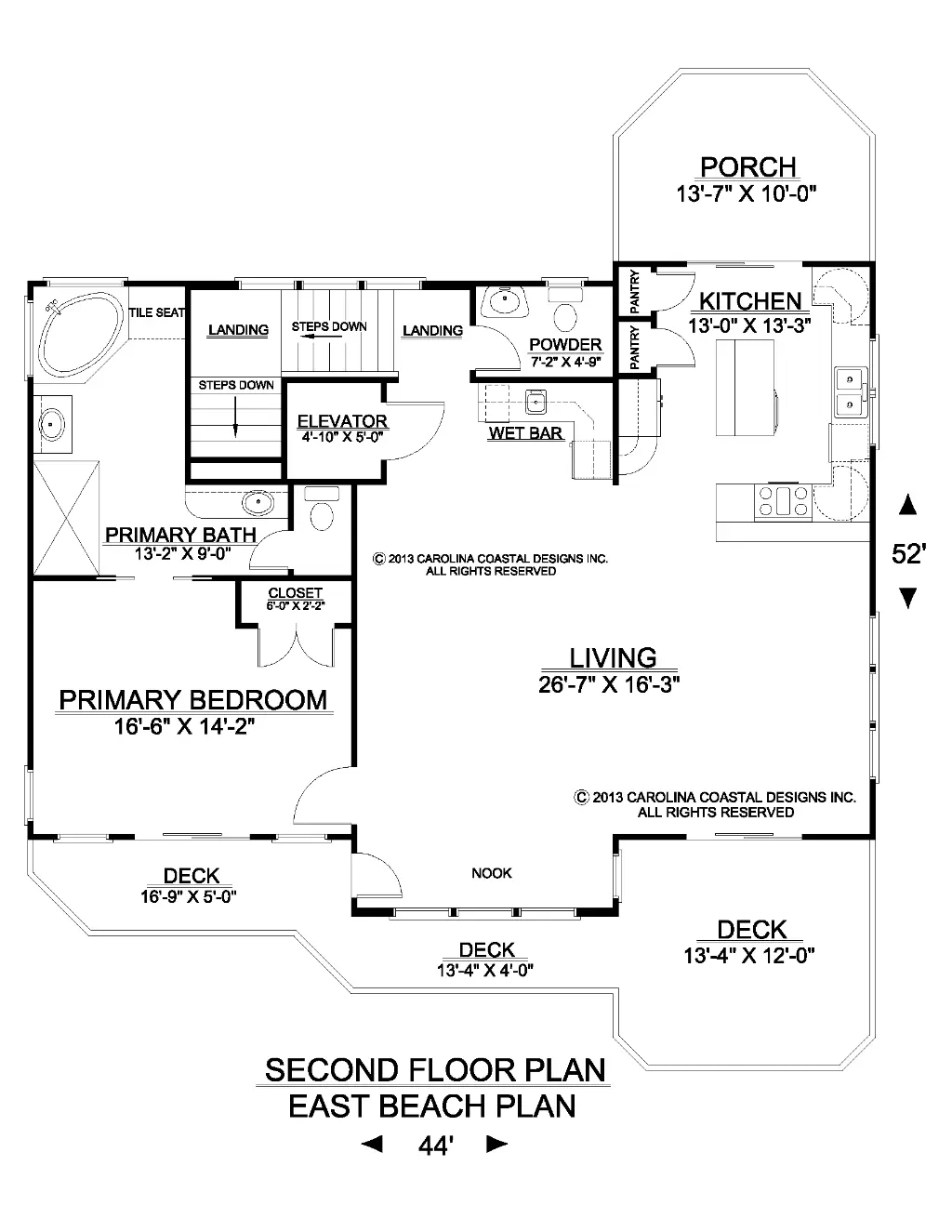 This 4-bedroom home features an inverted floor plan and scenic bi-level front porches, designed to enhance views and provide comfortable living for family and guests in coastal or other picturesque settings. An interior rear staircase and passenger elevator offer convenient access throughout. Note: The elevated deck and swimming pool were added after the original build; the construction drawings do not include the pool & deck design.