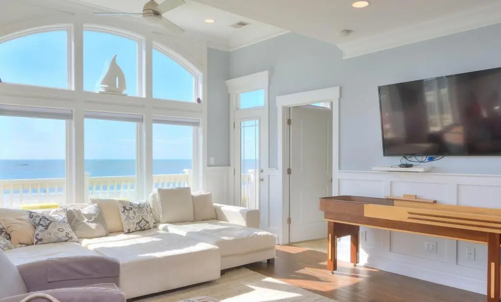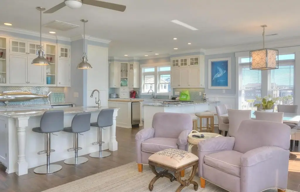 The main living level offers a large vaulted living/dining room with a generous wet bar. Sliding doors open to a full-width front deck. The modern kitchen features a work island, snack bar, and two closets, plus sliding-door access to the rear covered porch—ideal for outdoor dining. The private primary suite includes a spa bathroom, walk-in closet, and front-deck access. A convenient powder room is also provided.