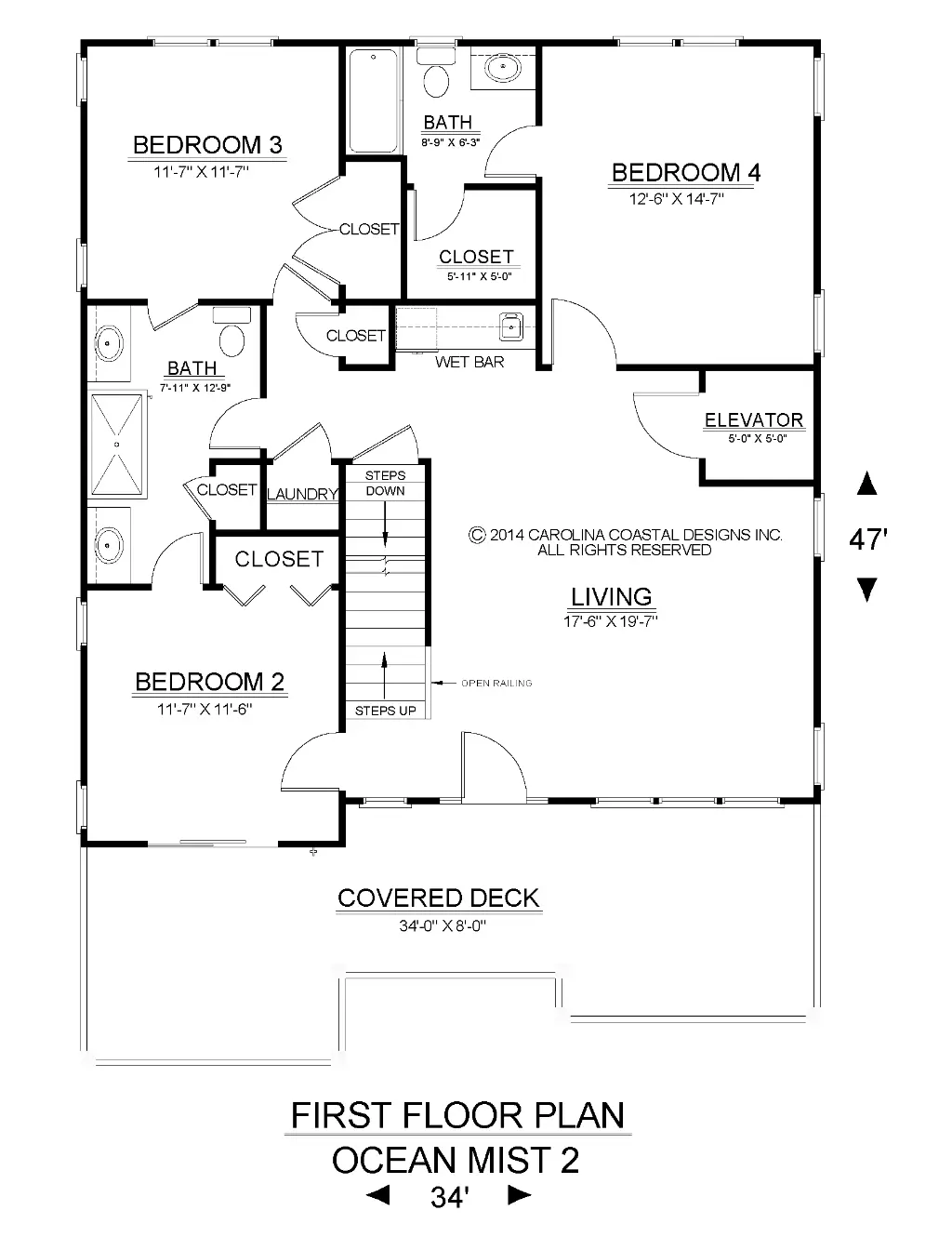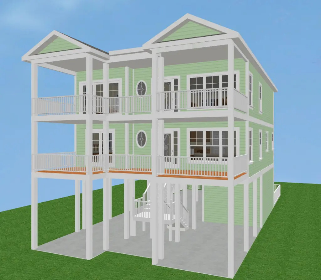 Ocean Mist II is an elegant 4-bedroom piling home designed to embrace light, openness, and scenic surroundings in coastal or other picturesque settings. Featuring an inverted floor plan, the private bedrooms and family room are located on the first level, while the upper floor provides bright, connected living spaces that maximize natural light and outdoor views. Dual-level covered porches extend the home’s living areas outdoors, while a passenger elevator and interior stairwell ensure easy access across all floors.