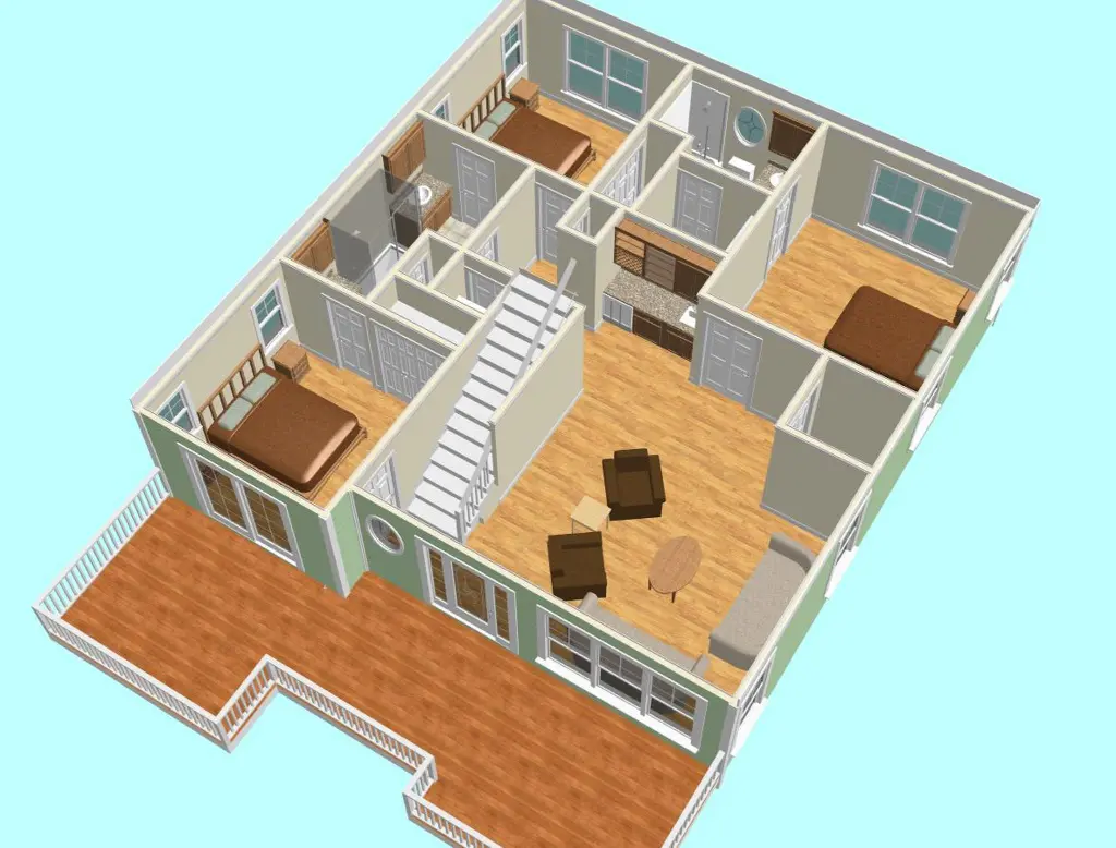 The first level offers three spacious bedrooms, two full bathrooms, a generous family room with optional wet bar, and a centrally located laundry area. Covered front decks create inviting spaces for outdoor relaxation or entertaining. This floor also includes elevator access for effortless movement throughout the home. An optional swimming pool and patio can further enhance this level, adding a resort-like outdoor environment during warmer seasons. 3D-rendered images are provided to help visualize room layouts and furniture placement for both levels.